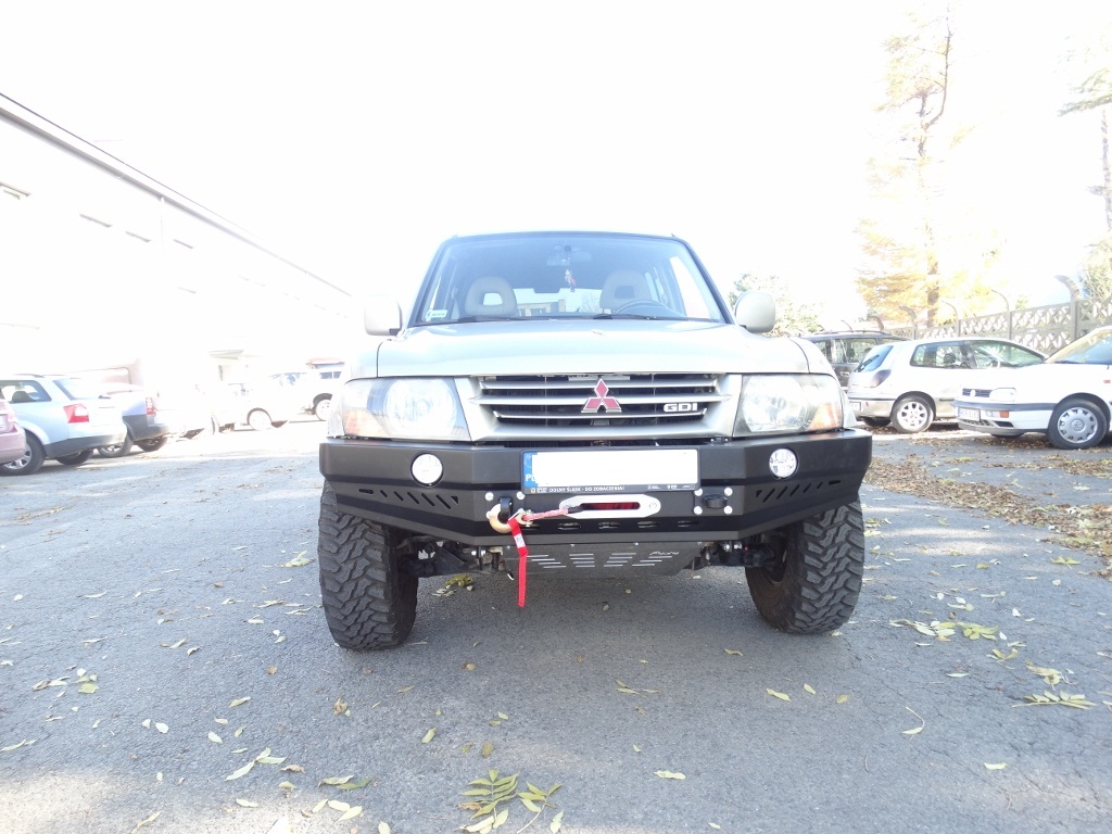 Przedni zderzak z płytą pod wyciągarkę i bullbarem, dedykowany dla samochodu MITSUBISHI PAJERO III 99-06. Główna konstrukcja zderzaka wykonana jest z blachy o grubości 3mm, a płyta pod wyciągarkę oraz mocowania do ramy z blachy grubości 5 mm. Produkt najpierw cięty jest laserowo, następnie gięty na prasie krawędziowej CNC, a właściwy kształt uzyskuje podczas ręcznej obróbki wykańczającej. Następnym etapem jest zabezpieczenie antykorozyjne polegające na cynkowaniu galwanicznym, oraz malowanie proszkowe które nadaje zderzakowi ostateczny wygląd.
