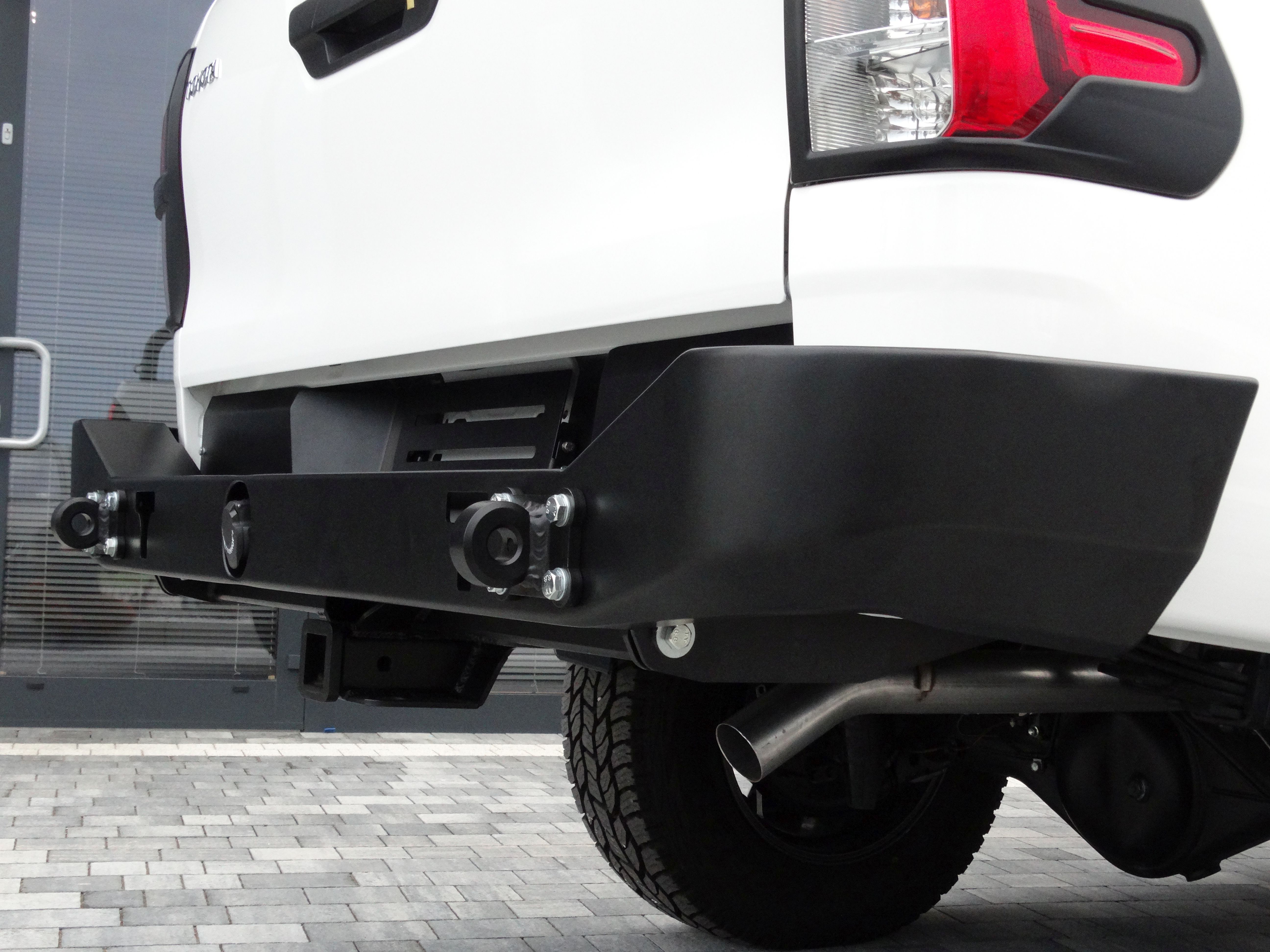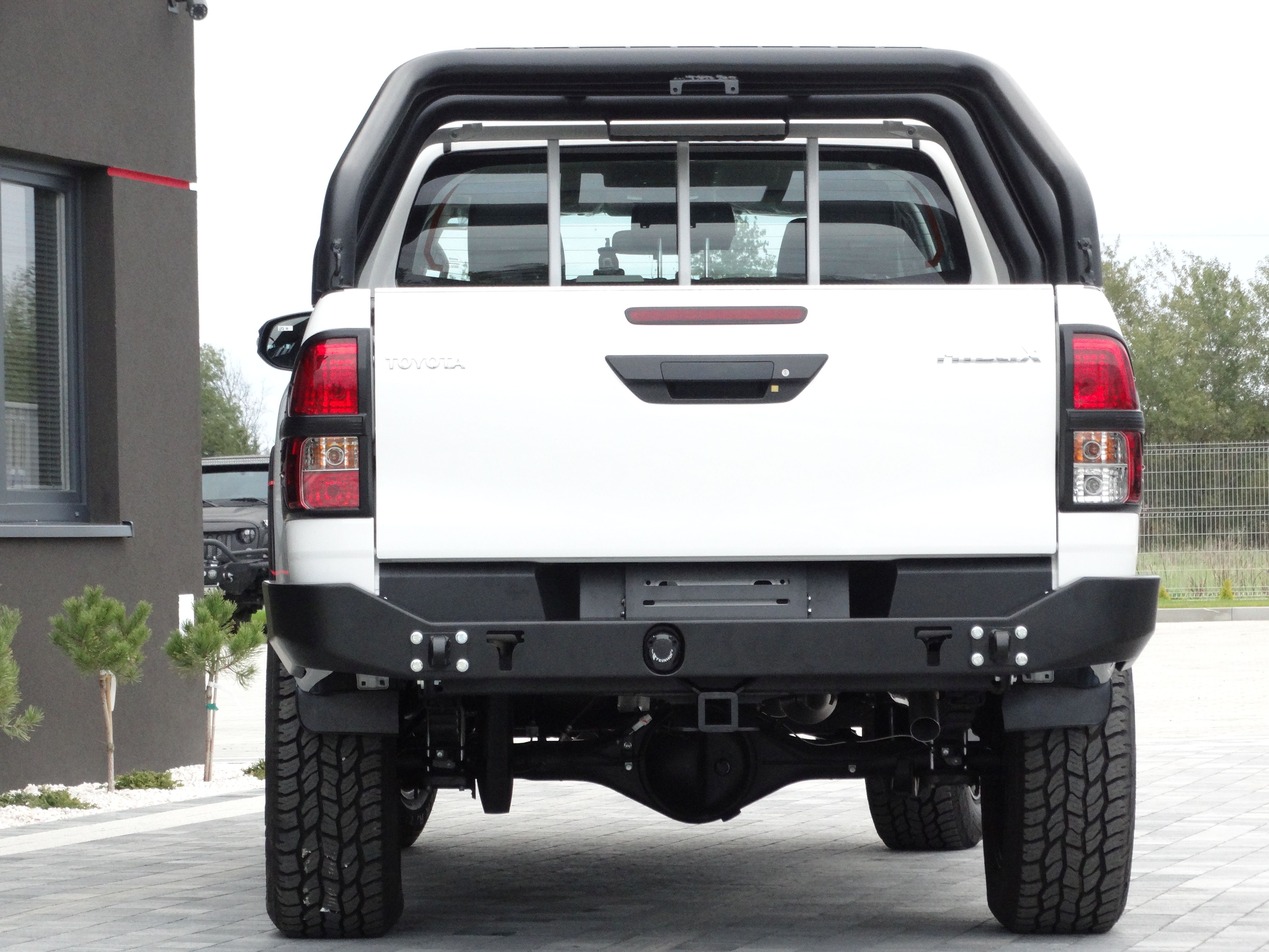 Nowy zderzak tylny do samochodu Toyota Hilux Revo firmy fabryka4x4 wykonany z blachy grubości 4mm mocowania do ramy grubości 5mm posiada otwory do podnośnika hi-lift oraz otwory mocowań uchwytów szekli mocowania szekli widoczne na zdjęciu nie są zawarte w cenie zderzaka. Zderzak cięty laserowo gięty na prasie krawędziowej śrutowany, cynkowany, lakierowany proszkowo.