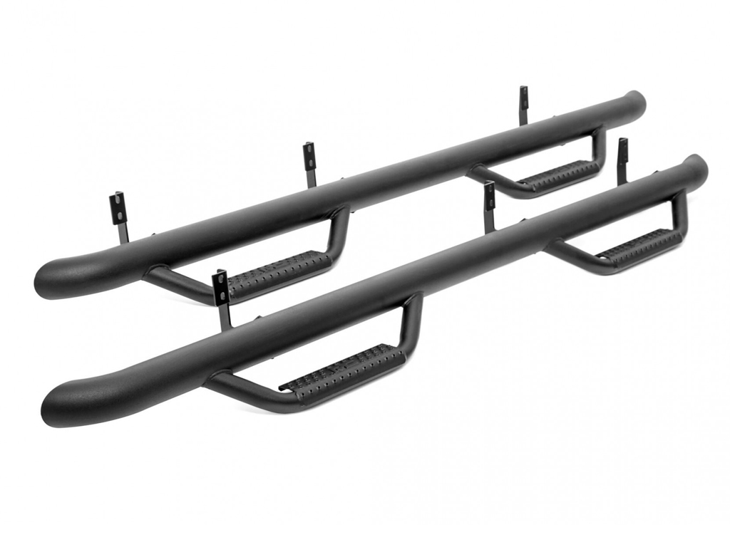 Progi firmy Rough Country poprawiają wygląd oraz ułatwiają wsiadanie do pojazdu. Progi mogą być zamontowane w pojeździe który jest po lifcie jak i przed. Innowacyjny design ukrywa wyeksponowane części ramy pod pojazdem oraz zapewnia dodatkową ochronę dla paneli bocznych. Progi Rough Country są wykonane z trwałego materiału pokrytego powłoką cynkową dzięki której są odporne na korozję. Progi są w kolorze czarnym co zapewnia im świetny wygląd.