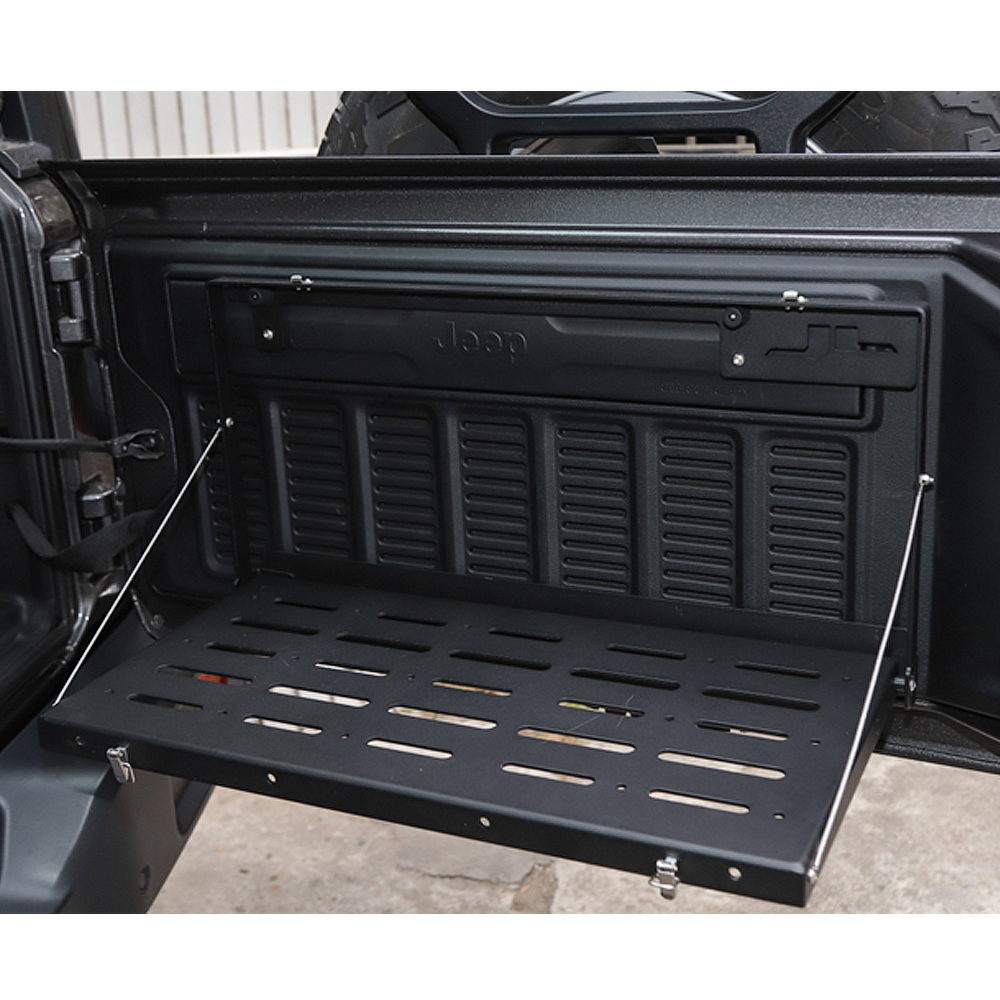 Praktyczna rozkładana półka mocowana do tylnej klapy bagażnika uzupełnia szeroką paletę niezwykle przydatnych akcesoriów do Twojego Jeepa firmy OFD Offroad Fabrication.