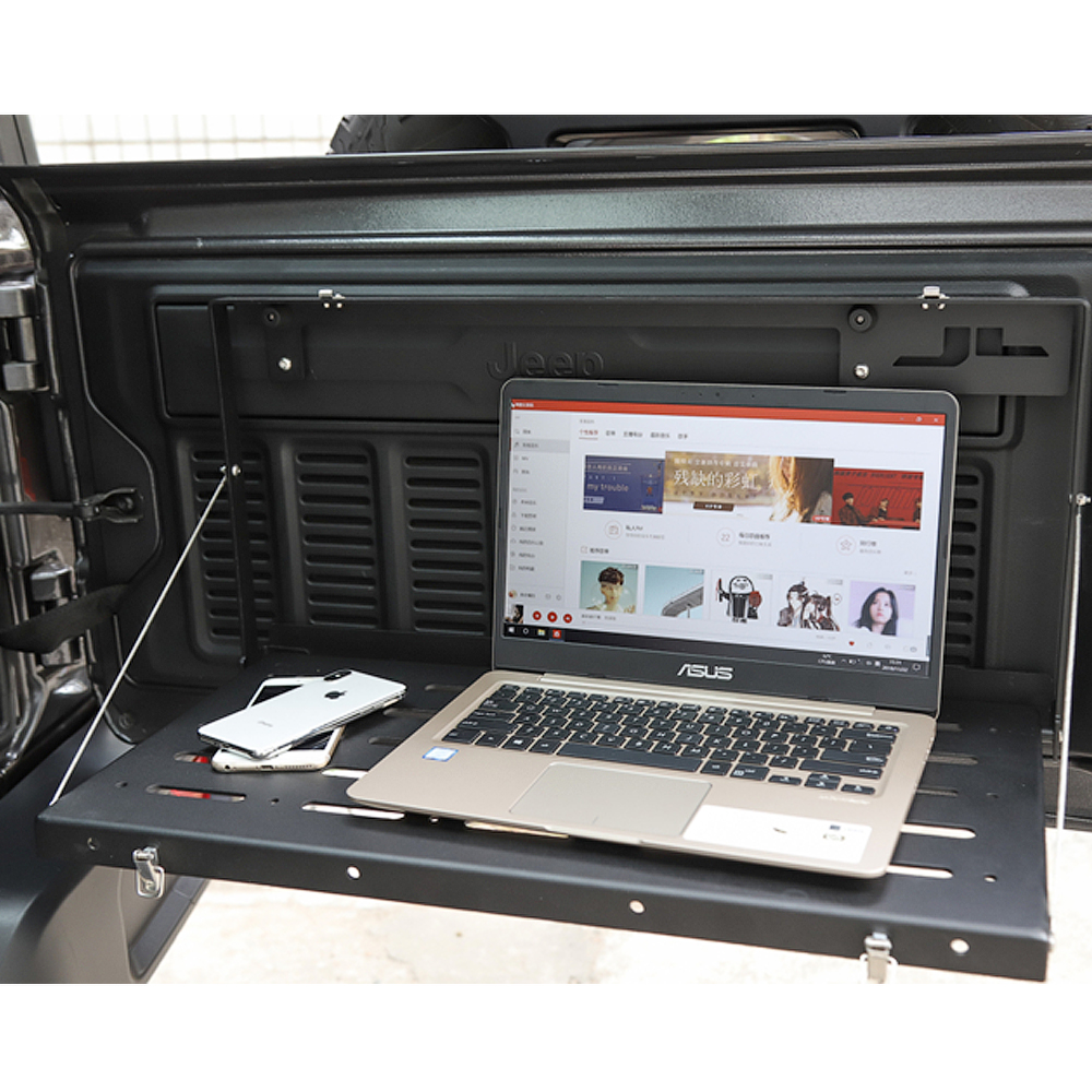 Zyskaj dodatkową, bezpieczną przestrzeń w terenie na laptopa czy na inne przedmioty do których będzie Ci potrzebny szybki i bezproblemowy dostęp. Wytrzymała konstrukcja doskonale sprawdzi się również w przypadku cięższych rzeczy. Wykończona w kolorze czarnym. Idealnie pasuje zarówno kształtem oraz kolorem do klapy bagażnika Jeepa Wranglera JL.
