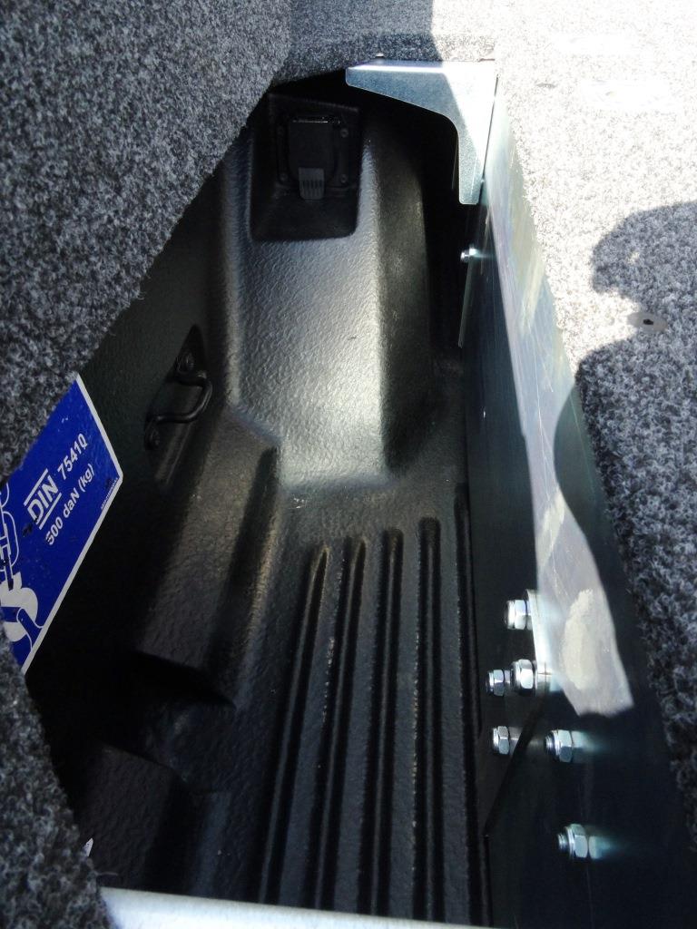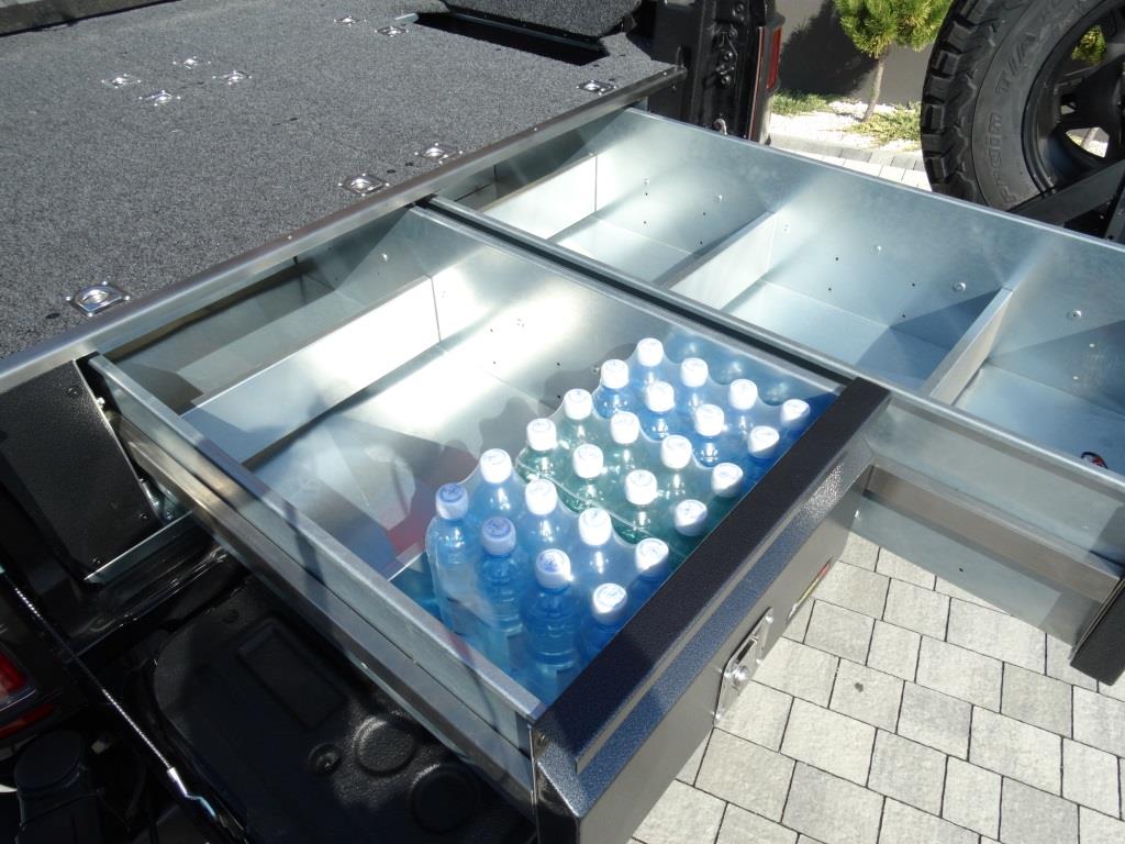 Zabudowa wyprawowa dedykowana do samochodu FORD RANGER 2015-. Konstrukcja nośna zabudowy, jak i szuflady, wykonane są z blachy stalowej, która jest cynkowana galwanicznie, co stanowi bardzo dobre zabezpieczenie antykorozyjne. Mechanizm otwierania szuflad składa się z kształtownika ze stali nierdzewnej oraz zespołu łożysk tocznych zamontowanych zarówno u dołu jak i u góry prowadnic, a także po bokach szuflady. Taka budowa prowadnic eliminuje wszelki luz między szufladą a konstrukcją nośną, co gwarantuje, że z zabudowy nie wydostają się nieprzyjemne dźwięki w czasie jazdy w terenie oraz zapewnia dużą niezawodność. Każda z szuflad wyposażona jest w dwie przegrody, które można zdemontować w zależności od potrzeb. Fronty malowane są proszkowe w kolorze srebrnym antycznym, co nadaje całości estetyki. Obie szuflady wyposażone są w solidne zamki ze stali nierdzewnej, które można zamknąć na klucz. Górna część wykonana jest ze sklejki pokrytej tkaniną filcową, zabezpieczoną na krawędziach aluminiowym narożnikiem, co powoduje że całość ładnie komponuje się z wnętrzem samochodu i jest przyjemna w użytkowaniu. Zabudowa wyposażona jest w osiem uchwytów bakisty, umożliwiających zabezpieczenie przed przesuwaniem się przedmiotów typu lodówka czy kufer, umieszczonych na jej powierzchni. Po bokach panelu z szufladami oraz za tylną kanapą znajdują się dodatkowe schowki, co umożliwia maksymalne wykorzystanie przestrzeni bagażnika oraz lepsze zorganizowanie przedmiotów, które zabieramy na wyprawę. Konstruując zabudowę zadbaliśmy o łatwość montażu, dzięki temu montaż może wykonać samodzielnie jedna osoba oraz o to, aby montaż odbywał się bez naruszania oryginalnego wnętrza bagażnika. Jednym z wielu atutów zabudowy jest fakt, że w każdym momencie można ją wymontować z samochodu i w razie konieczności zamontować ponownie.