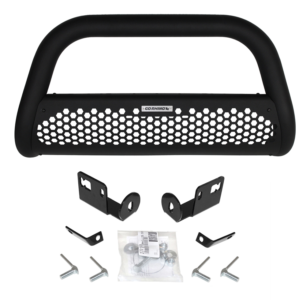 Bull Bar RC2 LR Go Rhino zapewnia dodatkową ochronę dla przodu Twojego Pick up'a. Został zaprojektowany w taki sposób aby zapewnić szybki montaż bez wiercenia. Bull bar posiada płytę osłonową z siatkowym heksagonalnym wzorem oraz możliwość zamontowania dwóch lamp LED. Jest pokryty czarną powłoką. Wszystkie bullbary wykonane są przy zachowaniu najwyższych standardów jakości.