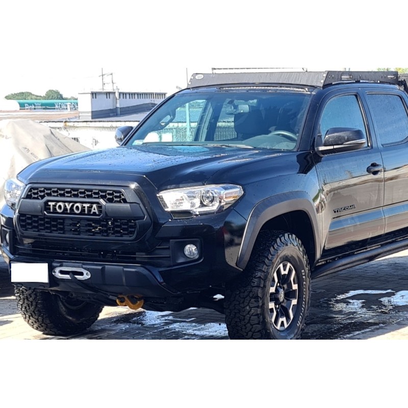 Toyota Tacoma 2016-2023 płyta montażowa wyciągarki pod fabryczny zderzak. Przykręcana do fabrycznych śrub i otworów w ramie pojazdu. Montaż nie wymaga wiercenia ani spawania. Wykonana z blachy stalowej konstrukcyjnej o grubości 6 mm oraz 8 mm. Śrutowana i malowana proszkowo w technologii dwuwarstwowej ze strukturą. Posiada wycięcie pod bębnem wyciągarki ułatwiający usuwanie zanieczyszczeń z liny. Waga ok.13,1 kg.