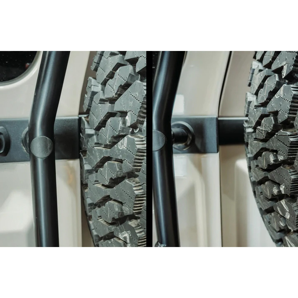 Mocowanie utrzymuje koło w jego oryginalnym ustawieniu i umożliwia korzystanie z fabrycznej osłony lub schowka. Uchwyt nie odwraca felgi na zewnątrz i podnosi koło zapasowe o 4,5 cm, zapewniając widoczność tylnej kamery