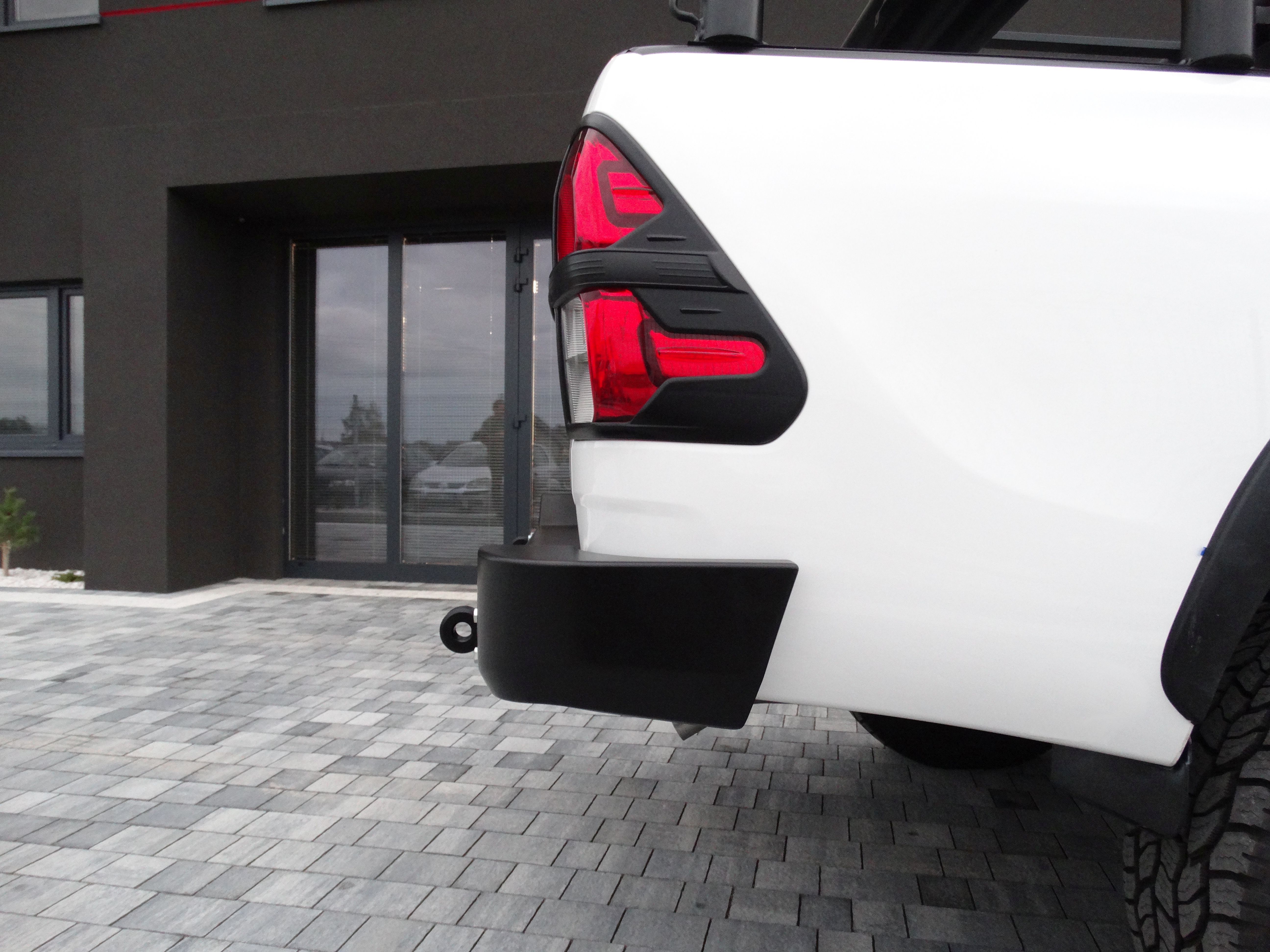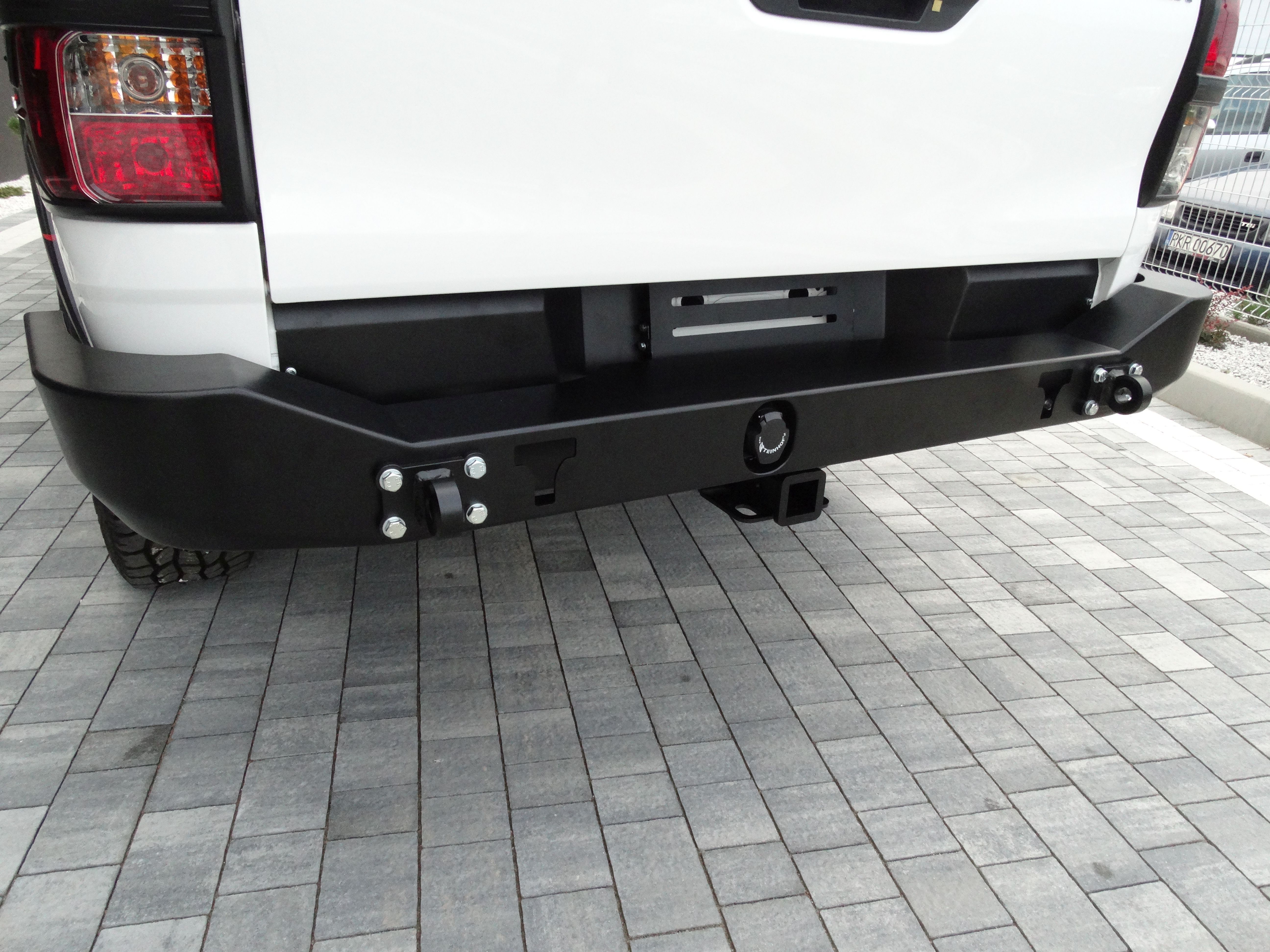 Nowy zderzak tylny do samochodu Toyota Hilux Revo firmy fabryka4x4 wykonany z blachy grubości 4mm mocowania do ramy grubości 5mm posiada otwory do podnośnika hi-lift oraz otwory mocowań uchwytów szekli mocowania szekli widoczne na zdjęciu nie są zawarte w cenie zderzaka. Zderzak cięty laserowo gięty na prasie krawędziowej śrutowany, cynkowany, lakierowany proszkowo.