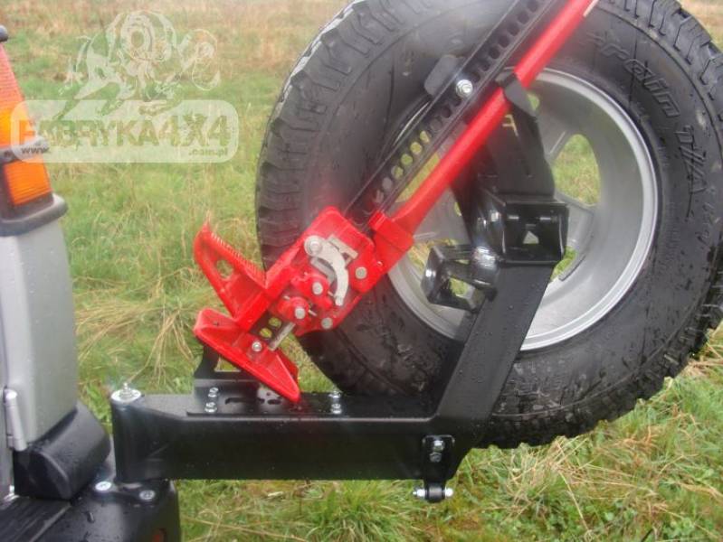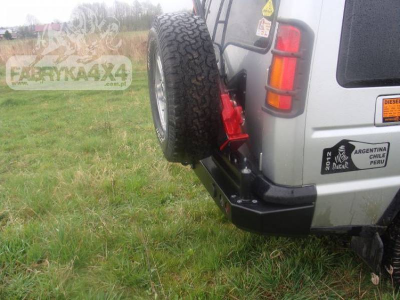 Mocowanie koła zapasowego do LAND ROVER DISCOVERY II dedykowane do zderzaka F4x4. Konstrukcja mocowania wykonana jest z blachy o grubości 3mm. Produkt najpierw cięty jest laserowo, następnie gięty na prasie krawędziowej, a właściwy kształt uzyskuje podczas ręcznej obróbki wykańczającej. Następnym etapem jest zabezpieczenie antykorozyjne polegające na cynkowaniu galwanicznym, oraz malowanie proszkowe które nadaje mocowaniu ostateczny wygląd. Mocowanie koła wspomaga sprężyna gazowa, która ułatwia jego zamykanie i otwieranie na nierównym terenie. Mocowanie jest bardzo przydatne w przypadku gdy auto posiada koła o dużej średnicy, ponieważ odciąża zawiasy klapy bagażnika. Dzięki solidnej konstrukcji mocowanie, nie przenosi drgań i nieporządancyh dźwięków do środka samochodu. Uchwyt blokowany jest metalową klamrą, która uniemożliwa samoczynne otwarcie mocowania.