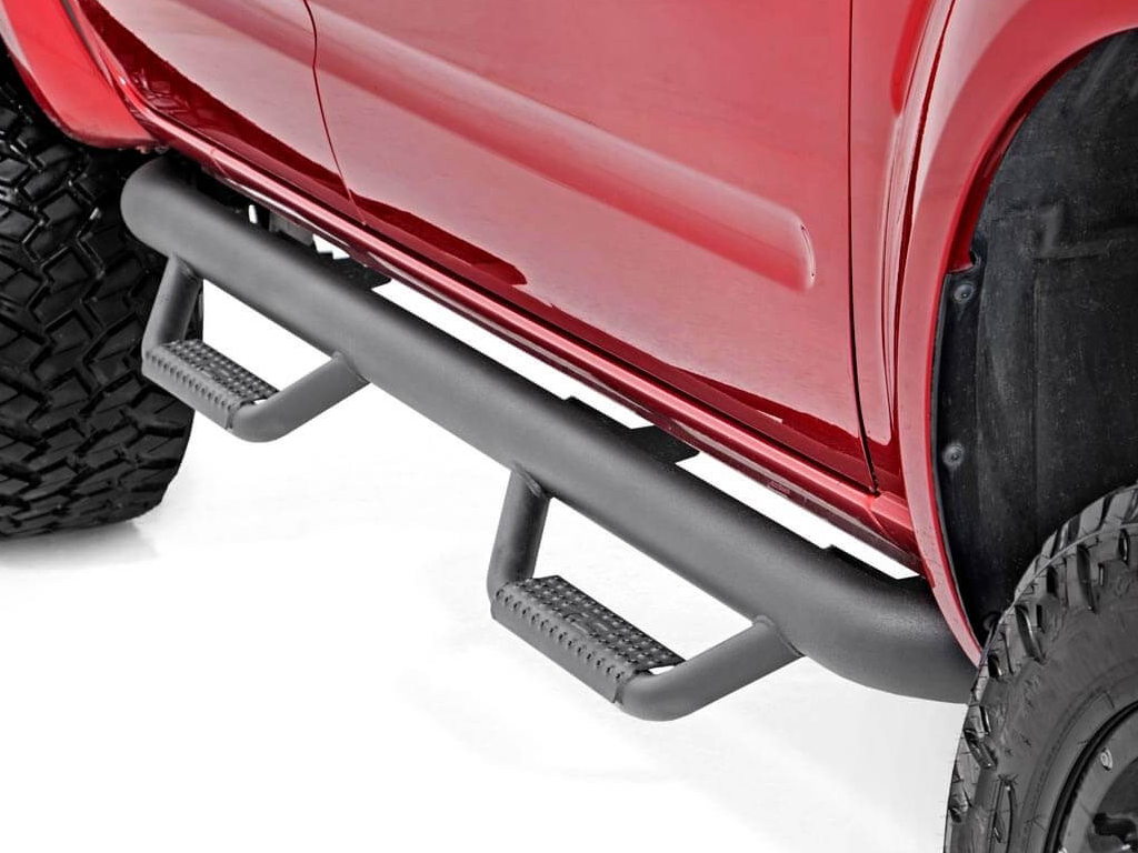 Progi firmy Rough Country poprawiają wygląd oraz ułatwiają wsiadanie do pojazdu. Progi mogą być zamontowane w pojeździe który jest po lifcie jak i przed. Innowacyjny design ukrywa wyeksponowane części ramy pod pojazdem oraz zapewnia dodatkową ochronę dla paneli bocznych. Progi Rough Country są wykonane z trwałego materiału pokrytego powłoką cynkową dzięki której są odporne na korozję. Progi są w kolorze czarnym co zapewnia im świetny wygląd.