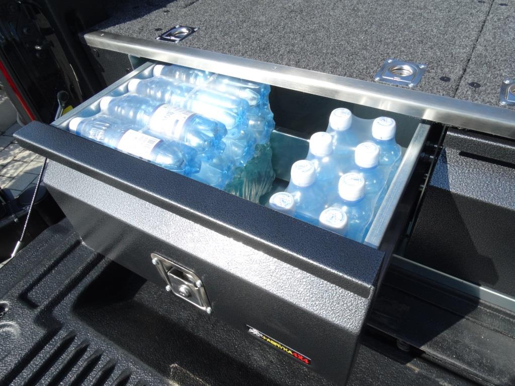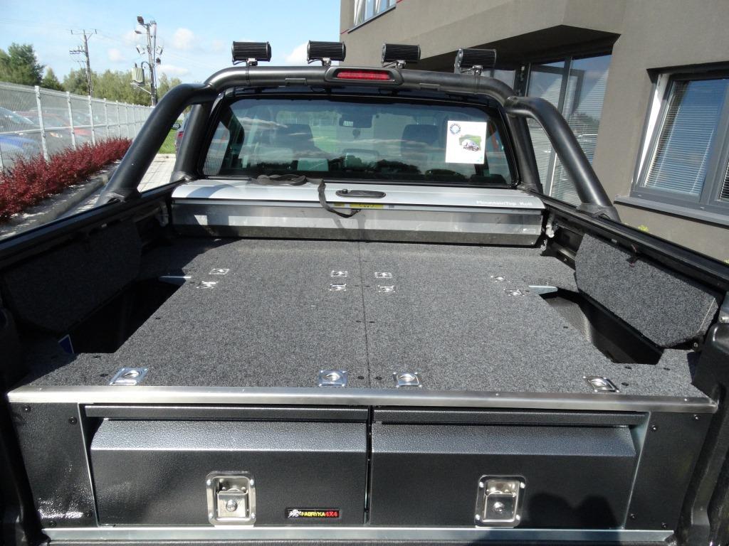 Zabudowa wyprawowa dedykowana do samochodu FORD RANGER 2015-. Konstrukcja nośna zabudowy, jak i szuflady, wykonane są z blachy stalowej, która jest cynkowana galwanicznie, co stanowi bardzo dobre zabezpieczenie antykorozyjne. Mechanizm otwierania szuflad składa się z kształtownika ze stali nierdzewnej oraz zespołu łożysk tocznych zamontowanych zarówno u dołu jak i u góry prowadnic, a także po bokach szuflady. Taka budowa prowadnic eliminuje wszelki luz między szufladą a konstrukcją nośną, co gwarantuje, że z zabudowy nie wydostają się nieprzyjemne dźwięki w czasie jazdy w terenie oraz zapewnia dużą niezawodność. Każda z szuflad wyposażona jest w dwie przegrody, które można zdemontować w zależności od potrzeb. Fronty malowane są proszkowe w kolorze srebrnym antycznym, co nadaje całości estetyki. Obie szuflady wyposażone są w solidne zamki ze stali nierdzewnej, które można zamknąć na klucz. Górna część wykonana jest ze sklejki pokrytej tkaniną filcową, zabezpieczoną na krawędziach aluminiowym narożnikiem, co powoduje że całość ładnie komponuje się z wnętrzem samochodu i jest przyjemna w użytkowaniu. Zabudowa wyposażona jest w osiem uchwytów bakisty, umożliwiających zabezpieczenie przed przesuwaniem się przedmiotów typu lodówka czy kufer, umieszczonych na jej powierzchni. Po bokach panelu z szufladami oraz za tylną kanapą znajdują się dodatkowe schowki, co umożliwia maksymalne wykorzystanie przestrzeni bagażnika oraz lepsze zorganizowanie przedmiotów, które zabieramy na wyprawę. Konstruując zabudowę zadbaliśmy o łatwość montażu, dzięki temu montaż może wykonać samodzielnie jedna osoba oraz o to, aby montaż odbywał się bez naruszania oryginalnego wnętrza bagażnika. Jednym z wielu atutów zabudowy jest fakt, że w każdym momencie można ją wymontować z samochodu i w razie konieczności zamontować ponownie.