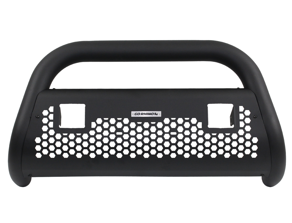Bull Bar RC2 LR Go Rhino zapewnia dodatkową ochronę dla przodu Twojego Pick up'a. Został zaprojektowany w taki sposób aby zapewnić szybki montaż bez wiercenia. Bull bar posiada płytę osłonową z siatkowym heksagonalnym wzorem oraz możliwość zamontowania dwóch lamp LED. Jest pokryty czarną powłoką. Wszystkie bullbary wykonane są przy zachowaniu najwyższych standardów jakości.