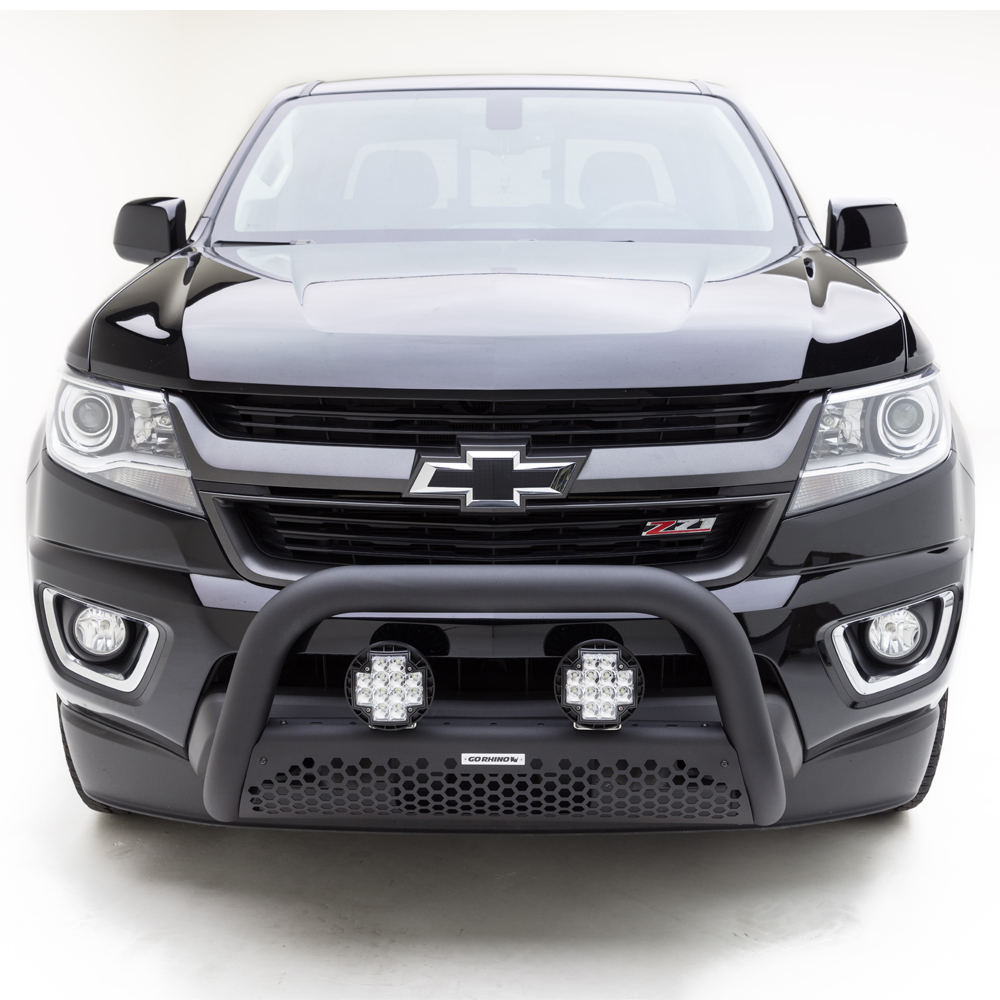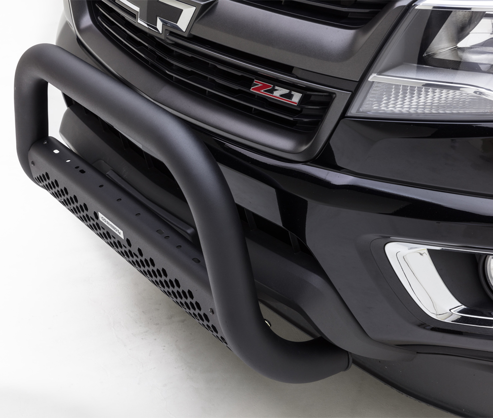Bull Bar RC2 LR Go Rhino zapewnia dodatkową ochronę dla przodu Twojego Pick up'a. Został zaprojektowany w taki sposób aby zapewnić szybki montaż bez wiercenia. Bull bar posiada płytę osłonową z siatkowym heksagonalnym wzorem oraz możliwość zamontowania dwóch lamp LED. Jest pokryty czarną powłoką. Wszystkie bullbary wykonane są przy zachowaniu najwyższych standardów jakości.