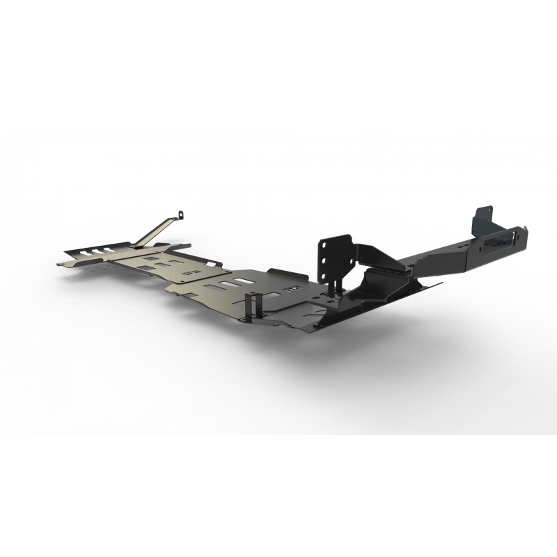 Pakiet Offroad do Toyota Tundra 2007-2014 . Czyli zestaw czterech pełnych i rozbudowanych osłon podwozia. Osłona chłodnic i silnika GRadTundra07-bl . Osłona miski olejowej i przedniego mostu GEnTundra07-bl. Osłona skrzyni biegów GTTundra07-bl. Osłona reduktora GTcTundra07-bl . Oraz dedykowana płyta montażowa wyciągarki WMTundra07. Płyty osłonowe wykonane z blachy stalowej konstrukcyjnej o grubości 4 mm. Śrutowane i malowane proszkowo w technologi dwuwarstwowej ze strukturą i podkładem antykorozyjnym klasy 5. Przykręcane w fabryczne otwory w ramie pojazdu. Montaż nie wymaga wiercenia ani spawania. Dodatkowe otwory i wycięcia zapobiegają przegrzewaniu się elementów napędu i ułatwiają usuwanie błota. Płyta wyciągarki ze stali konstrukcyjnej o grubości 6 i 8 mm. Waga zestawu ok. 51,4 kg.