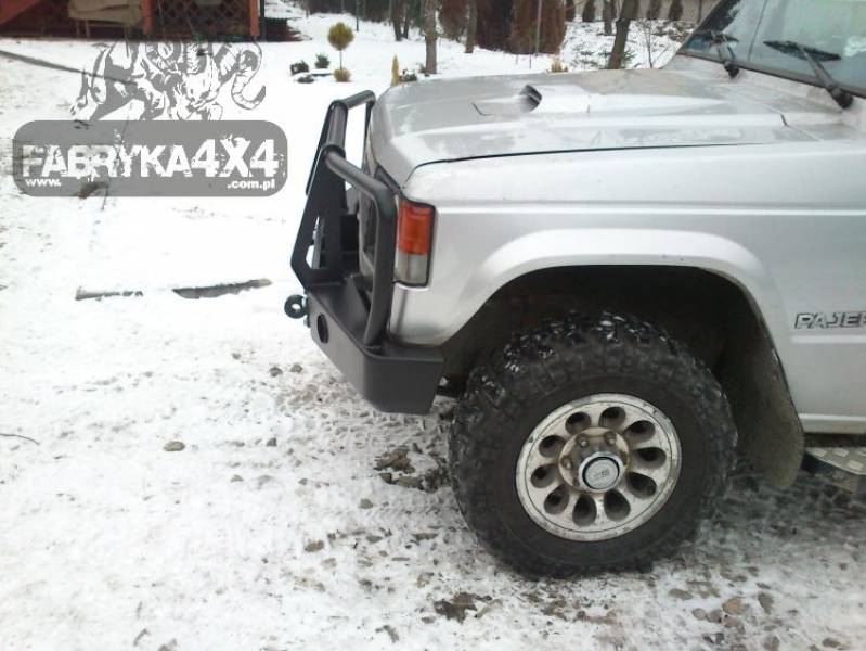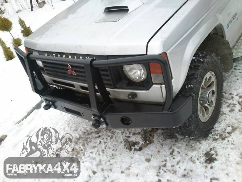 Przedni zderzak z płytą pod wyciągarkę i bullbarem, dedykowany dla samochodu MITSUBISHI PAJERO I 82-91. Główna konstrukcja zderzaka wykonana jest z blachy o grubości 3mm, a płyta pod wyciągarkę oraz mocowania do ramy z blachy grubości 5 mm. Produkt najpierw cięty jest laserowo, następnie gięty na prasie krawędziowej CNC, a właściwy kształt uzyskuje podczas ręcznej obróbki wykańczającej. Następnym etapem jest zabezpieczenie antykorozyjne polegające położeniu cynkowego podkładu proszkowego, oraz malowanie proszkowe które nadaje zderzakowi ostateczny wygląd.