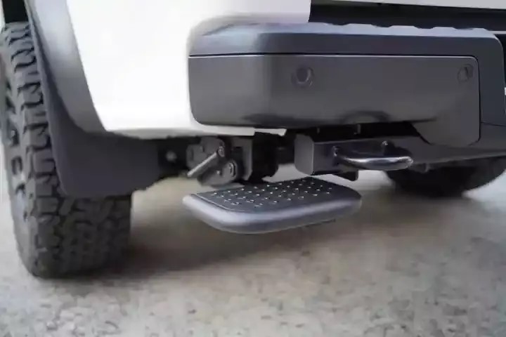 Jak zapewne udało Ci się zauważyć na zdjęciach, stopień jest składany. Jeśli nie chce Ci się schylać, wystarczy że podniesiesz go butem. Opuścisz go w ten sam sposób, nie ma tu żadnych skomplikowanych instrukcji. Dzięki temu szybko, łatwo i bezpiecznie sięgniesz do paki swojej terenówki bez otwierania klapy. Wytrzymałe zawiasy i łożyska ze stali nierdzewnej zapewniają bezproblemowe działanie mechanizmu.